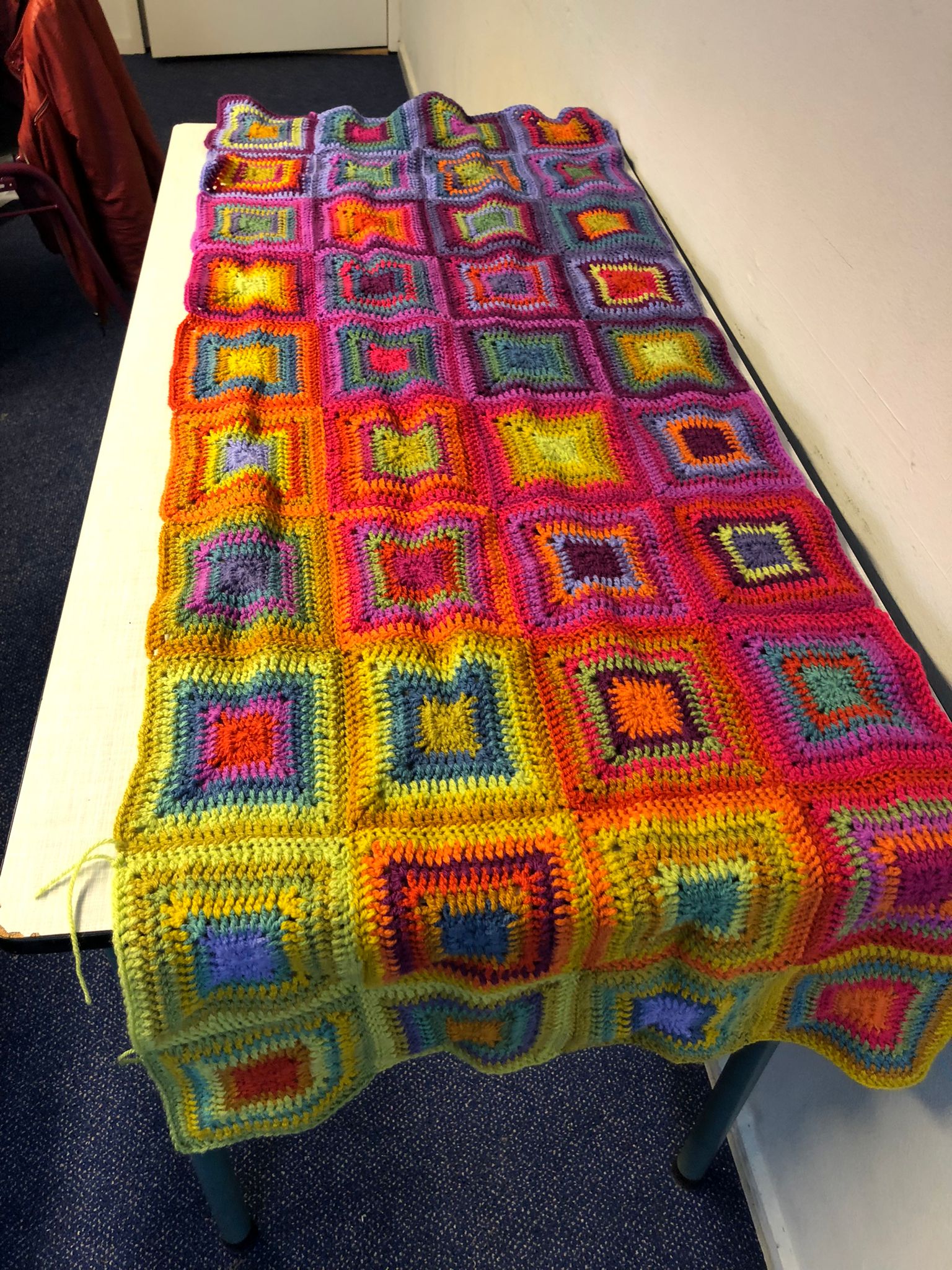 Laatst had een bee maatje een prachtig haakwerk mee naar onze bee. Een regenboogdeken in fraaie warme tinten.